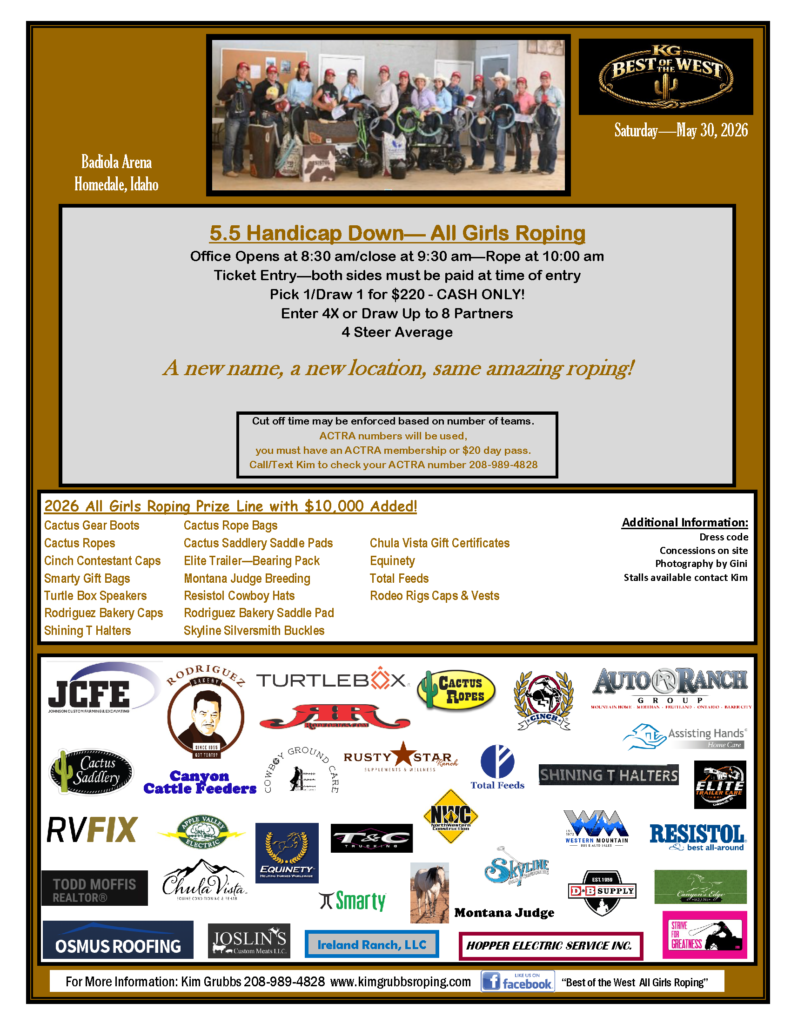 The KG Best of the West is an annual All Girl roping that used to be called Go Rope roping. It has grown to be the largest All Girl roping in the Northwest with $10,000 added money plus prized. We hope you join us for 2026!